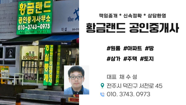 우리동네 목록 전주 황금랜드 공인중개사 2025-07-28 본문 전주시 덕진구 시천로 45 대표 채수성 010 3743 0973 “회사는 통신판매중개자로서 입점 판매자가 등록한 상품, 거래 정보 및 이용자 간 거래에 대해 어떠한 책임도 부담하지 않습니다.” 관련자료 목록