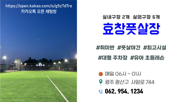 우리동네 목록 광주 효창풋살장 2025-08-27 본문 광주 광산구 사암로 744 062 954 1234 “회사는 통신판매중개자로서 입점 판매자가 등록한 상품, 거래 정보 및 이용자 간 거래에 대해 어떠한 책임도 부담하지 않습니다.” 관련자료 목록