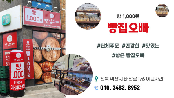우리동네 목록 익산시 빵집오빠 2025-09-01 본문 전북 익산시 배산로 176 010 3482 8952 “회사는 통신판매중개자로서 입점 판매자가 등록한 상품, 거래 정보 및 이용자 간 거래에 대해 어떠한 책임도 부담하지 않습니다.” 관련자료 목록