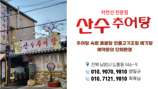 우리동네 목록 남원 자연산 전문점 산수 추어탕 2025-12-12 본문 010 9070 9810 양일규 010 7121 9810 최옥님 “회사는 통신판매중개자로서 입점 판매자가 등록한 상품, 거래 정보 및 이용자 간 거래에 대해 어떠한 책임도 부담하지 않습니다.” 관련자료 목록